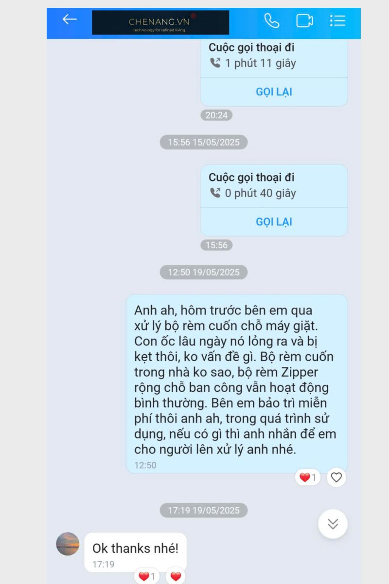 Hệ rèm Zipper & rèm cầu vồng tại The Legacy -- Khi niềm tin từ khách hàng dẫn tới một cơ hội mới 1. Lời nhắn từ người quen -- niềm tin được chia sẻ - Một tháng sau khi lắp cho nhà anh H. , điện thoại
