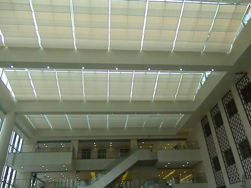 Rèm trần xếp ly tự động che nắng mái kính trung tâm thương mại