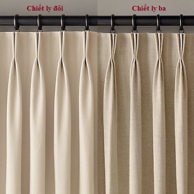 - Rèm vải chiết ly hay còn gọi là Rèm vải chết ly là loại rèm vải mà tấm vải được may nhóm các múi vải nhỏ với nhau theo từ 2 đến 3 nhóm, tạo thành một sóng vải (múi vải). Cách may này thường áp dụng đối với lớp vải voan để định hình múi vải và tăng thêm sự nhẹ nhàng, quyến rũ của vải voan. Đối với những ô cửa cao và nhỏ, người ta cũng dùng loại rèm này.