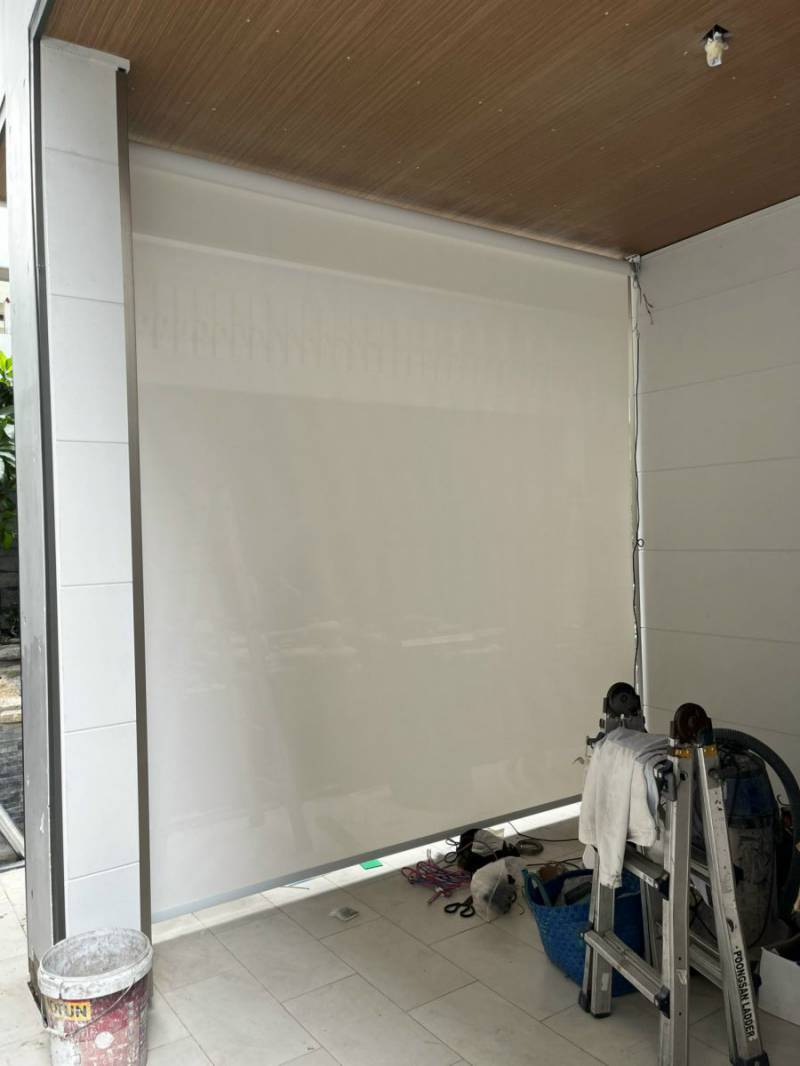 Hệ rèm cuốn dây cáp tự động che nắng, mưa gió hướng Tây cho hành lang biệt thự nhà khách tại Hà Nội  .