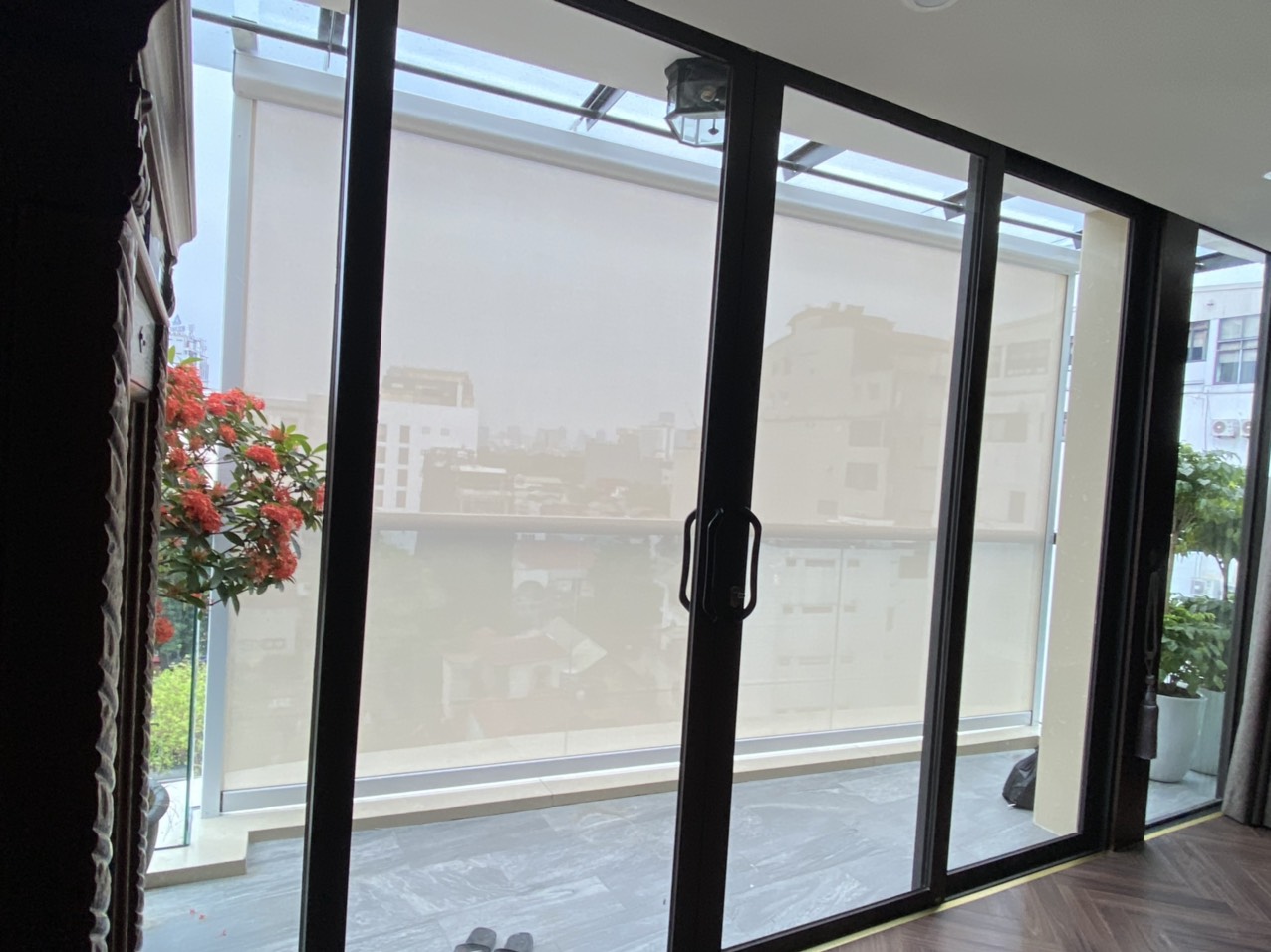 Hệ rèm cuốn tự động Zipper che nắng, mưa gió tại ban công nhà phố Bùi Thị Xuân, quận Hoàn Kiếm, Hà Nội.